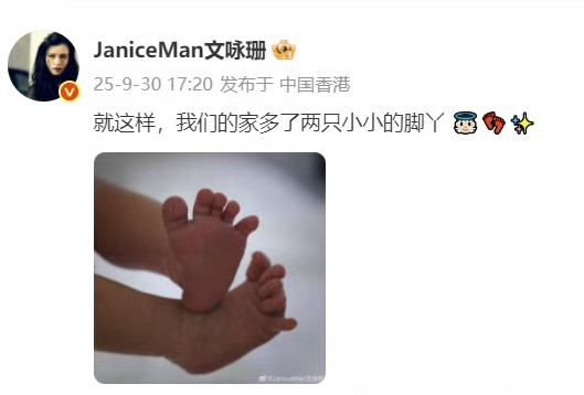 2025年9月30日,演员文咏珊在社交平台发布一张婴儿脚丫照片,配文“就这样,我们的家多了两只小小的脚丫”,瞬间引爆热搜。没有冗长的预告,没有刻意炒作,这位以低调著称的演员用最温暖的方式,向世界宣告了新生命的到来。