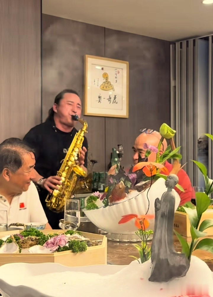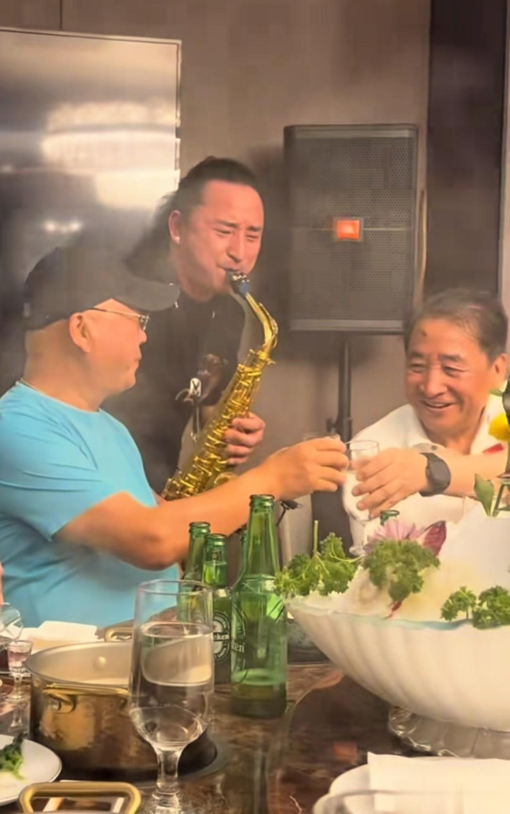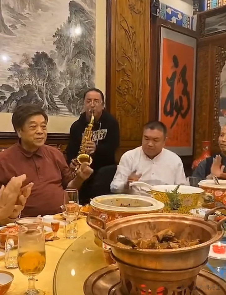 众人推杯换盏的时候,青年萨克斯演奏家刘家军,吹起了萨克斯为大家助兴,他演奏的音乐似乎很有感染力,以至于张永平起身离座,随着音乐扭动了起来;姜昆和其他好友也听得很陶醉。