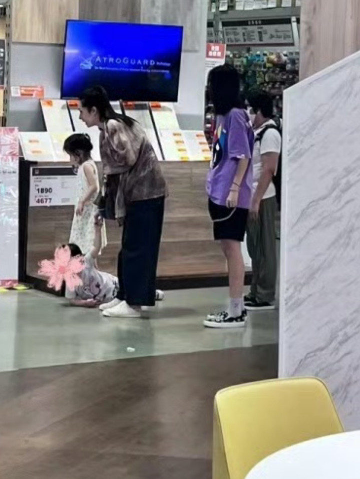 另外一张照片里,郭碧婷弯着腰牵着儿子,儿子似乎在闹脾气,倒在地上耍赖,女儿则非常乖巧的站在一旁。