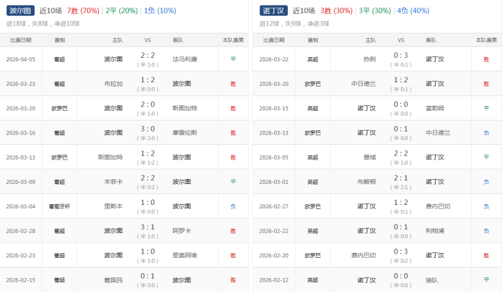 从近 10 场状态来看,波尔图 7 胜 2 平 1 负,胜率高达 70%,期间仅在葡萄牙杯爆冷输球,其余赛事保持不败,攻防两端稳定输出,18 次破门仅失 8 球,净胜球 10 个。诺丁汉森林近 10 场仅 3 胜 3 平 4 负,胜率仅 30%,面对英超强队时屡遭败绩,虽有爆冷击败热刺的高光,但稳定性严重不足,12 次进球失 9 球,净胜球仅 3 个,防线漏洞百出。