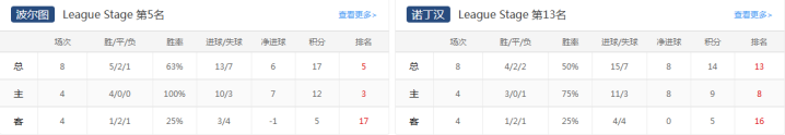 波尔图在欧罗巴联赛阶段以 5 胜 2 平 1 负、17 分的战绩高居第 5,展现出顶级豪门的统治力。球队主场表现堪称完美,4 战全胜,胜率 100%,狂轰 10 球仅丢 3 球,净胜球高达 7 个,巨龙球场俨然是对手的噩梦。反观诺丁汉森林,联赛阶段 4 胜 2 平 2 负积 14 分排名第 13,客场表现拉胯,4 个客场仅 1 胜 2 平 1 负,胜率 25%,攻防两端毫无统治力。