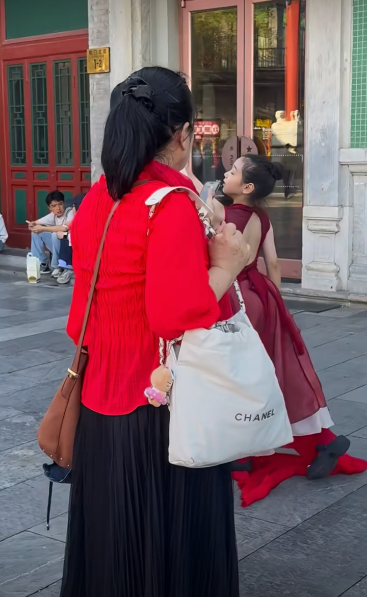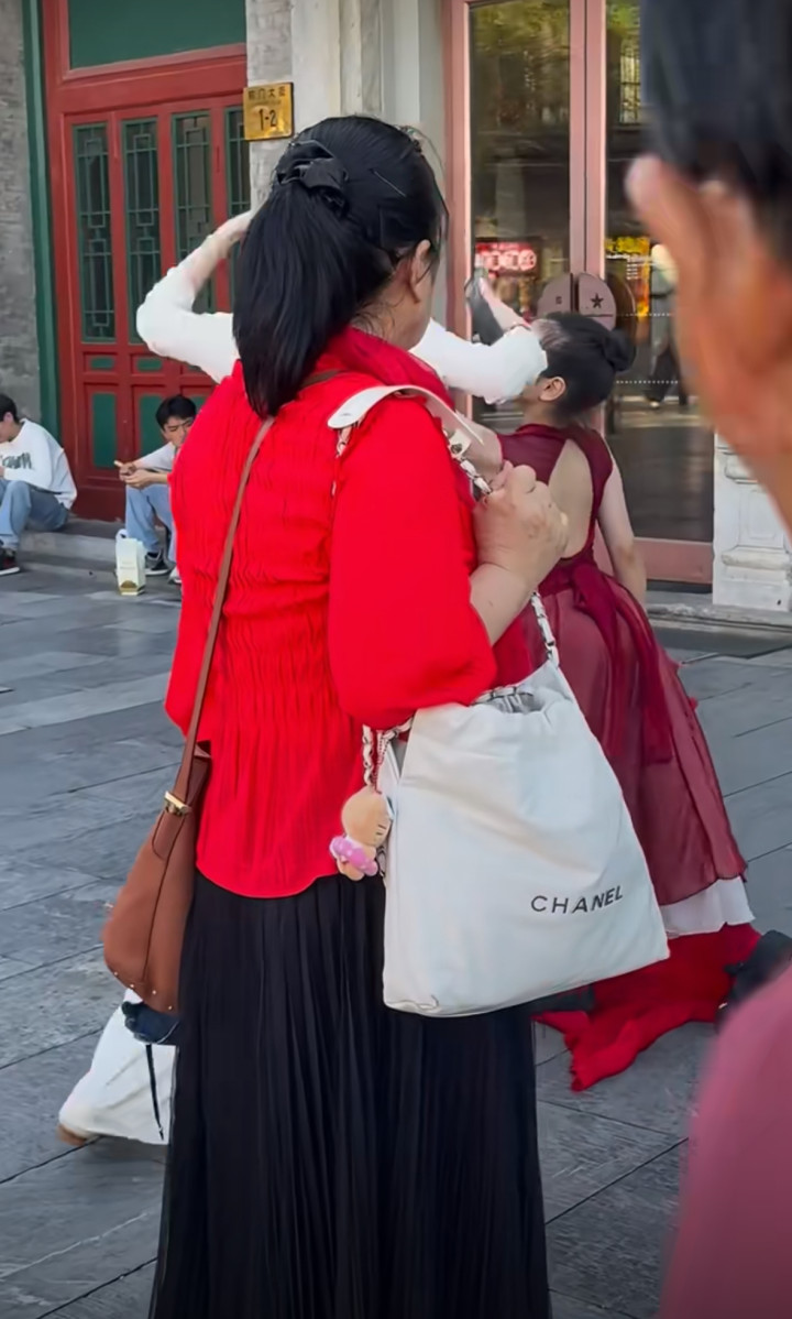 当天,小酒窝的母亲董璇并没有露面,据网友透露,陪伴小酒窝来前门大街的是董璇的母亲,她身穿红色外套搭配黑色长裙,肩上背着多个包包,小酒窝在跳舞录视频时,姥姥就站在一旁等待,时不时与路人聊上几句。