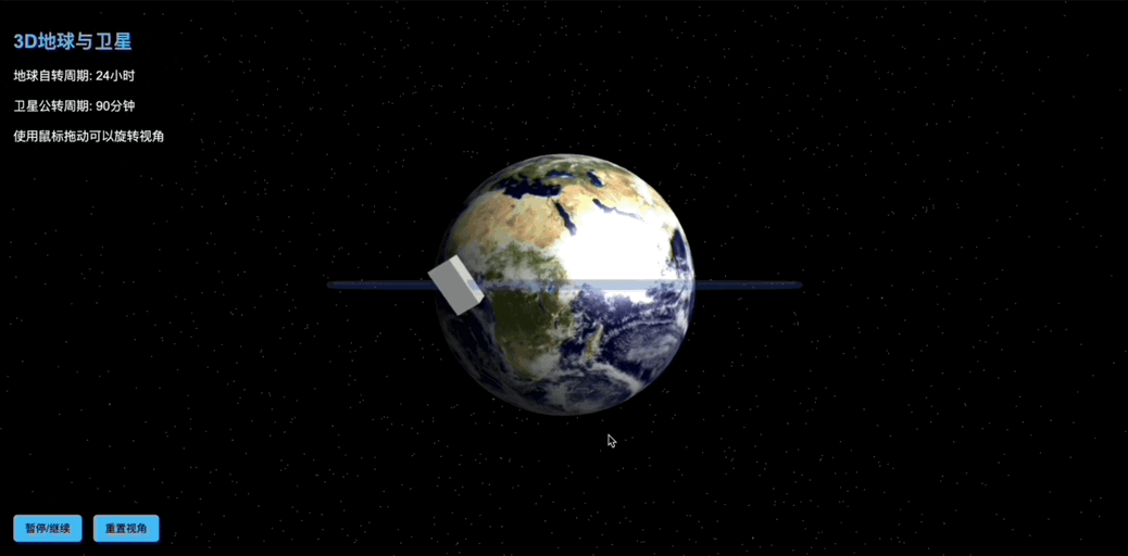 拿来生成3D交互式地球与卫星演示模型,用户可以通过鼠标拖拽旋转视角,直观地观察地球与卫星的空间运动关系: