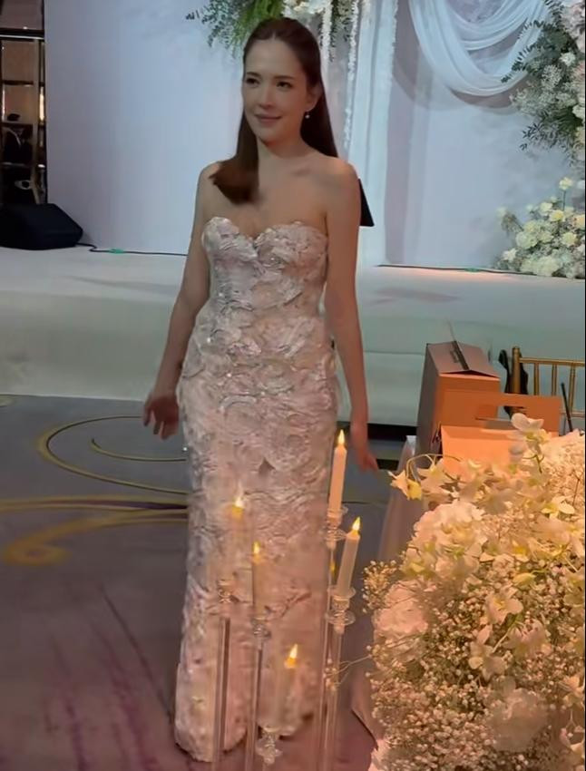 许玮甯一袭抹胸白纱,事业线傲人,妆容精致自然,脸蛋光滑得像剥壳鸡蛋,身材丰腴却不失曲线,婚礼现场的状态简直不要太好!