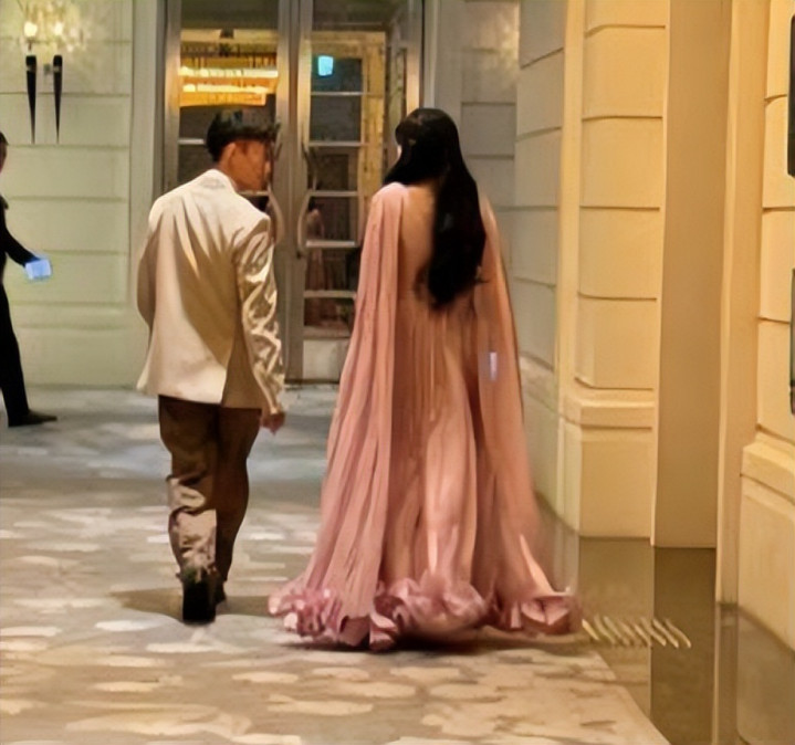 只见她穿芭比粉深V礼服,长裙摆拖地,曲线玲珑,大秀锁骨和腰线,化浓妆配大波浪长发、夸张假睫毛,齐刘海微油但整体优雅。