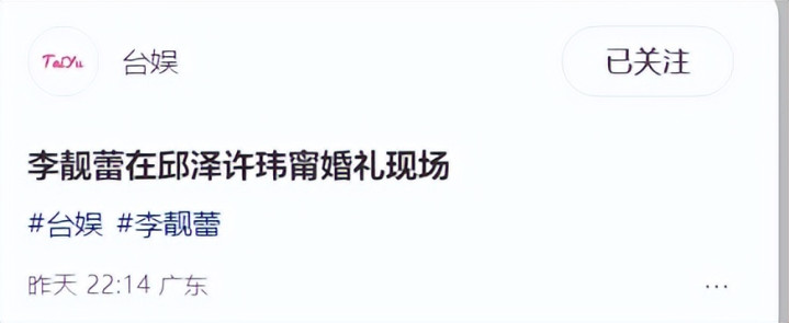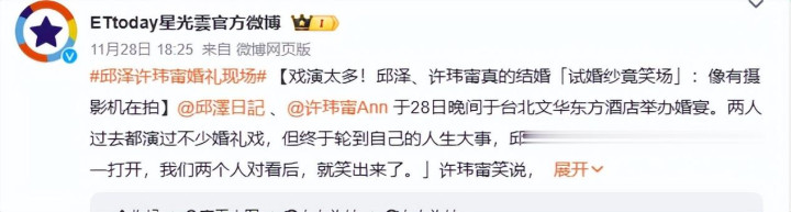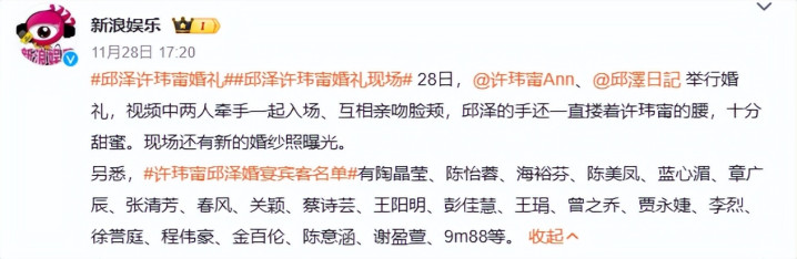 宾客名单一曝光,#许玮甯邱泽婚宴宾客名单# 直接上热搜,半个中国台湾娱乐圈的明星都去了。