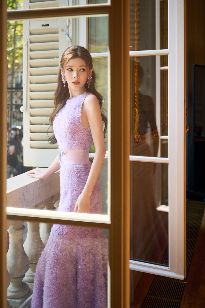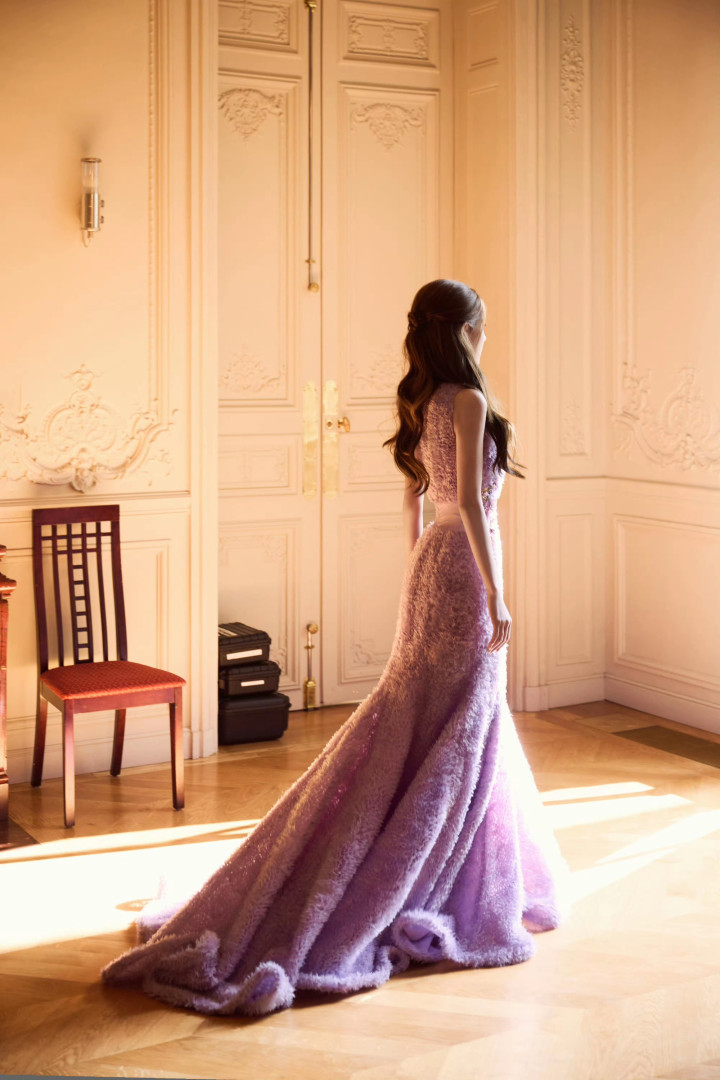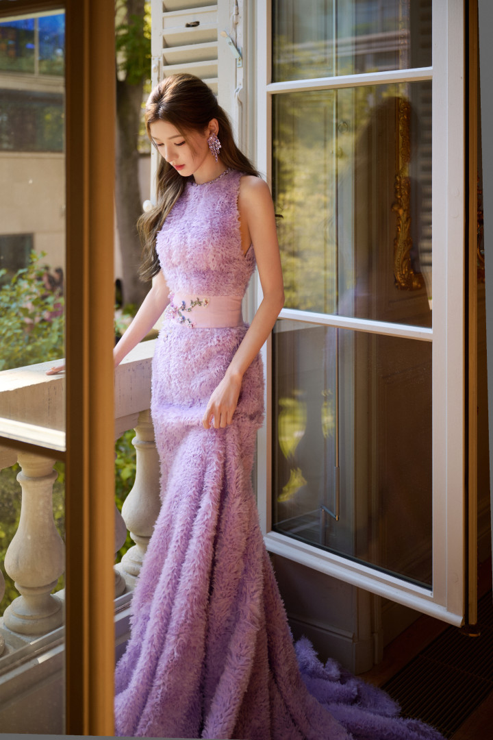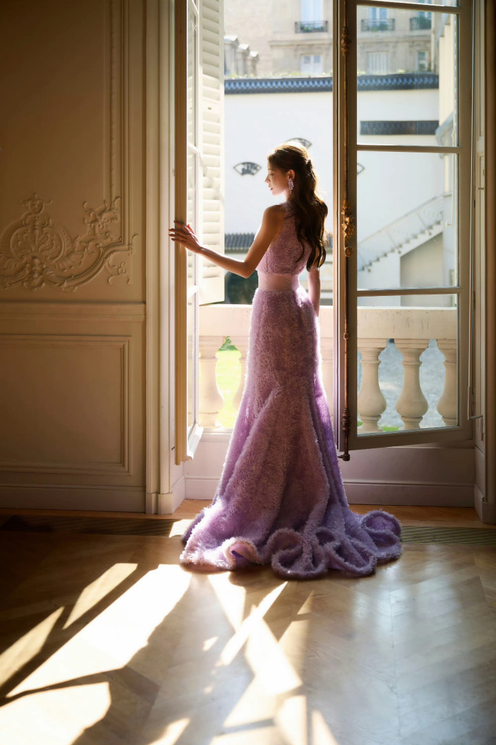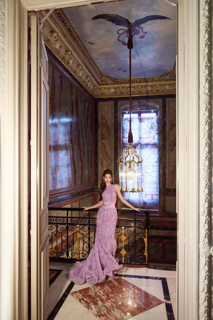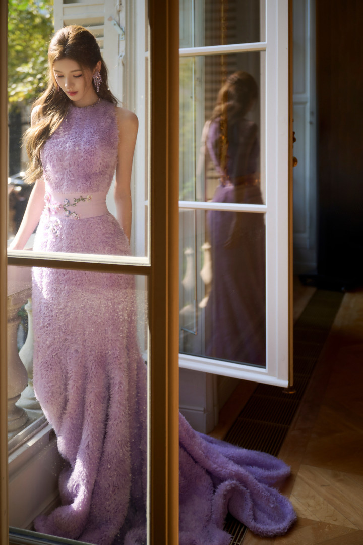 张予曦身披La Koradior 2026春夏高定系列紫裙亮相巴黎时装周。