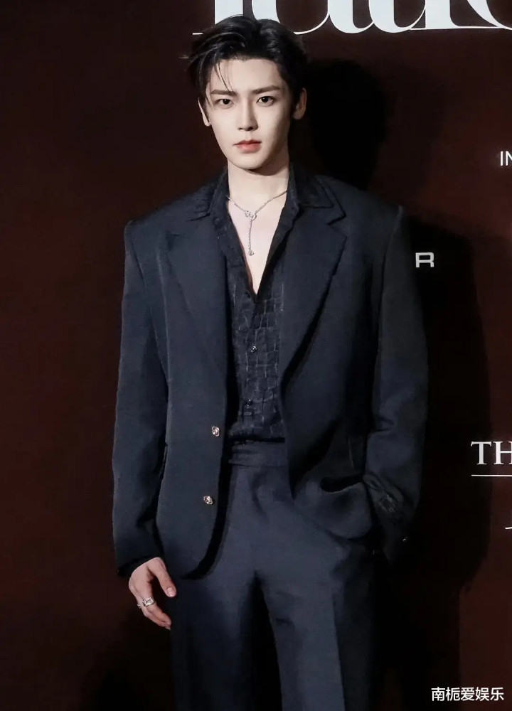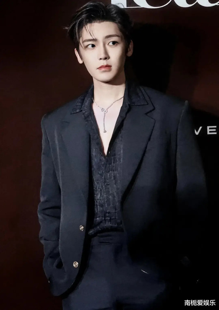 深V设计勾勒出精致锁骨线条,利落剪裁将肩线与腰身比例衬托得近乎完美,仿佛从名利场小说中走出的矜贵公子。他步履稳健,神情淡然,每一个抬手侧身的瞬间都被镜头捕捉成“绅士感教科书”。冷白肤色与冷冽珠宝交相辉映,项链、胸针与手链的叠戴细节更添层次,被粉丝直呼“行走的艺术品”。