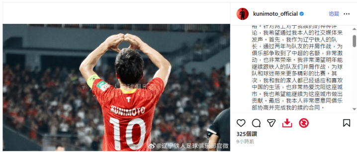 邦本宜裕写道:“大家好,我是辽宁铁人队长邦本宜裕。针对网上对于我续约的种种评论,我希望通过我本人的社交媒体来发声。首先,我作为辽宁铁人的队长,通过两年与队友的并肩作战,为俱乐部争取到了中超的名额,非常激动,也非常荣幸。我非常渴望明年能继续跟铁人的队友们并肩作战,为球队和球迷带来更多精彩的比赛。其次,我和我的家人都已经适应和喜欢中国的生活,也非常热爱沈阳这座城市。我也希望能继续为这座城市做出贡献。最后,我本人非常愿意同俱乐部协商并完成我的续约合同。”